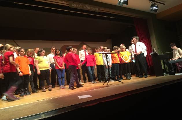 Die Lehrerin Charlotte Kübler hat mit den Kindern verschiedene Songs einstudiert. Die frischen Kinderstimmen in keck gesungenen Liedern zauberten im dunklen Saal da und dort Handys der Begeisterung in die Höhe, um mit einem Filmchen ein bleibendes Andenken zu schaffen. Die Schulkinder, die sich freuten, in einem zweiten Auftritt gemeinsam „mit so vielen Männern“ zu singen, zeigten sich in Helene Fischers Lied überhaupt nicht „Atemlos“